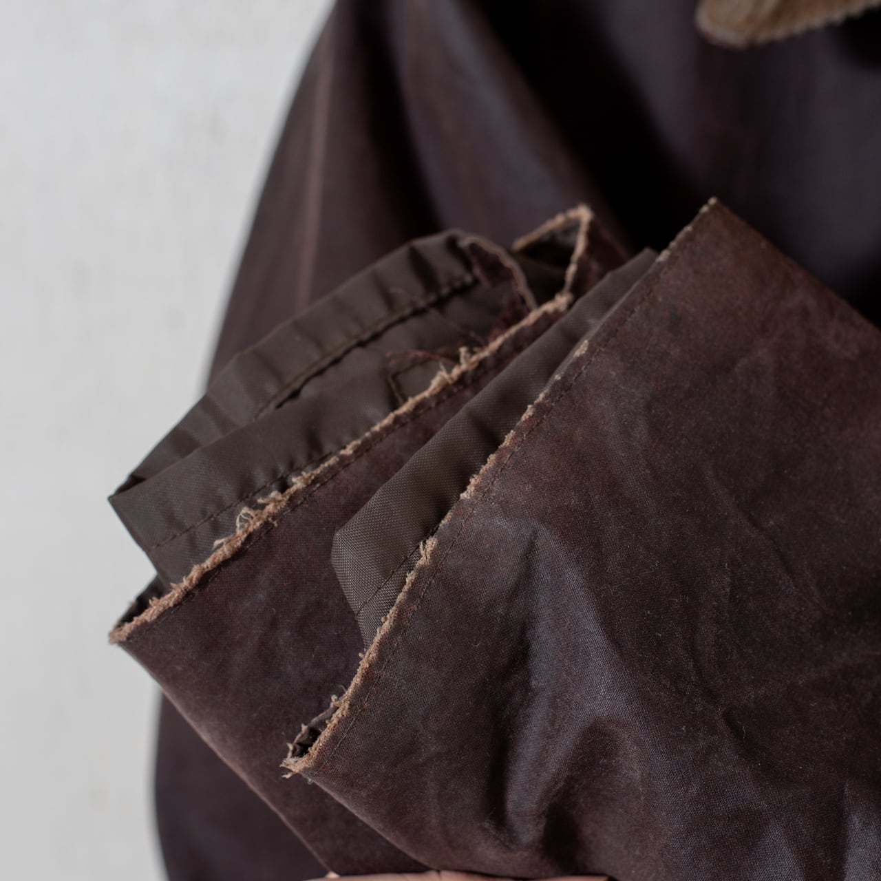 セットインスリーブにスリークォーターレンクスの作り、これを凛とした張りのあるヘビーオンスのワックスコットンで誂えより背筋が伸びるような佇まいに。